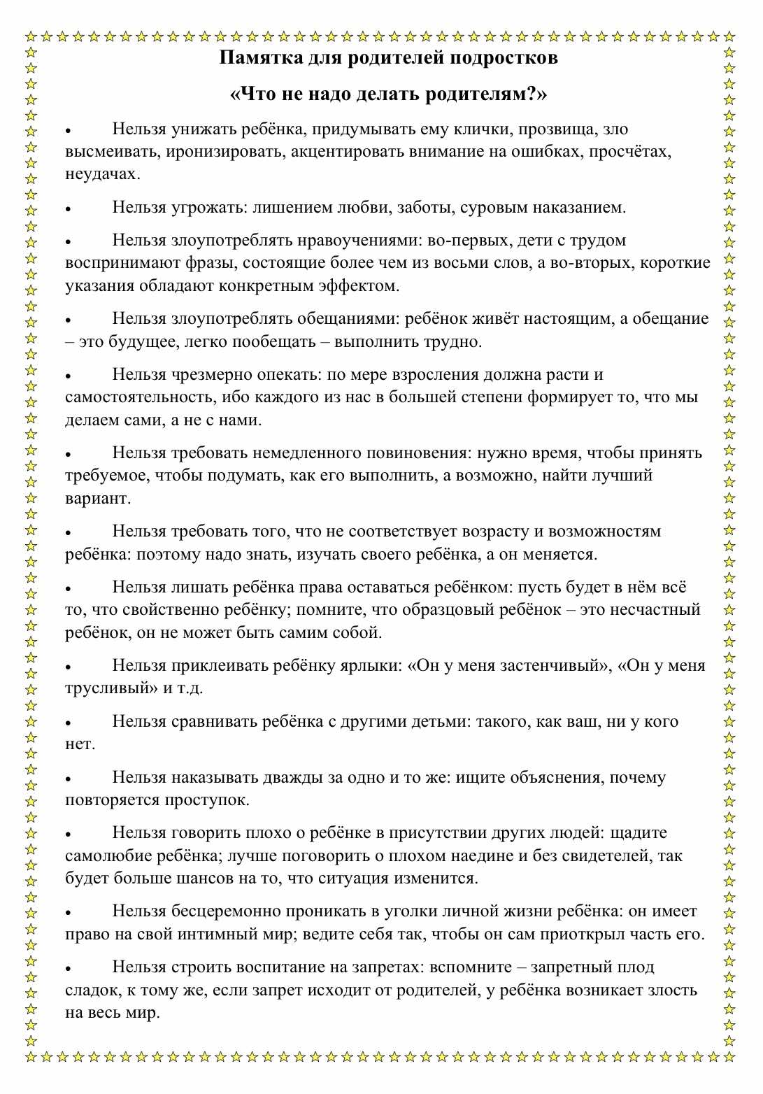 Памятка для родителей подростков «Что не надо делать родителям?»