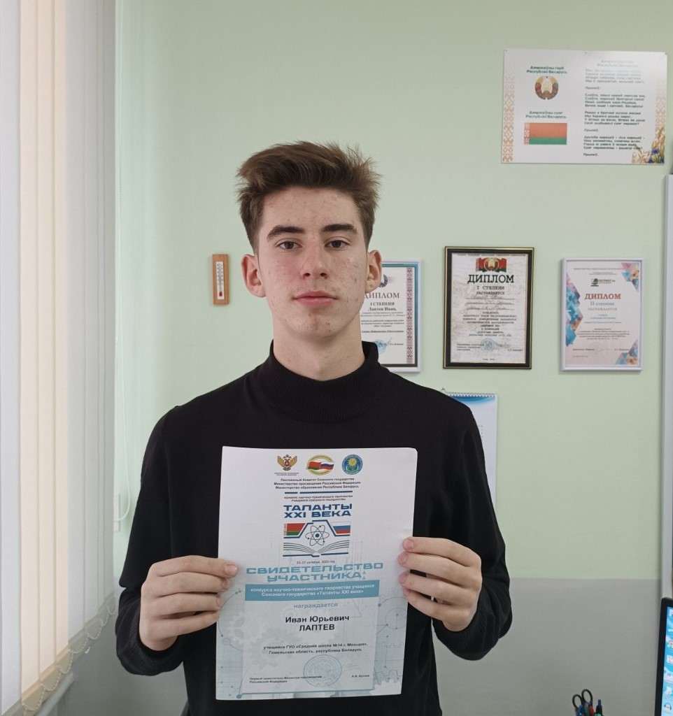Лаптев Иван достойно представил нашу школу на конкурсе научно-технического творчества учащихся Союзного государства «Таланты XXI века». Мероприятие прошло в Москве с 23 по 27 октября и собрало молодых талантов из разных стран.